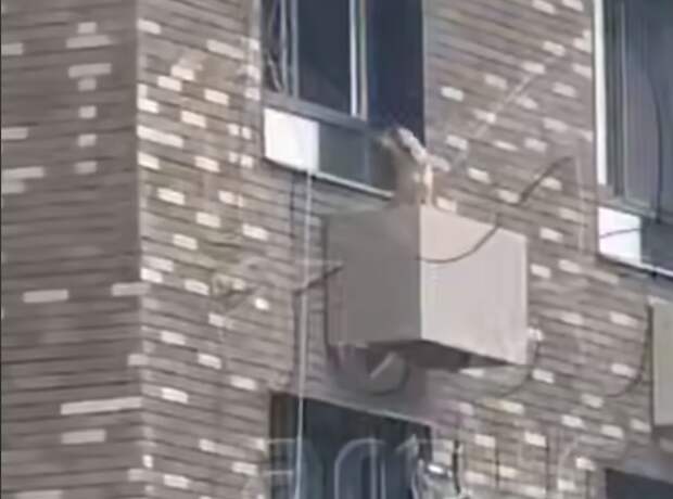 В Южно-Сахалинске благополучно завершилась спасательная операция для пса, застрявшего на корзине для кондиционера на большой высоте