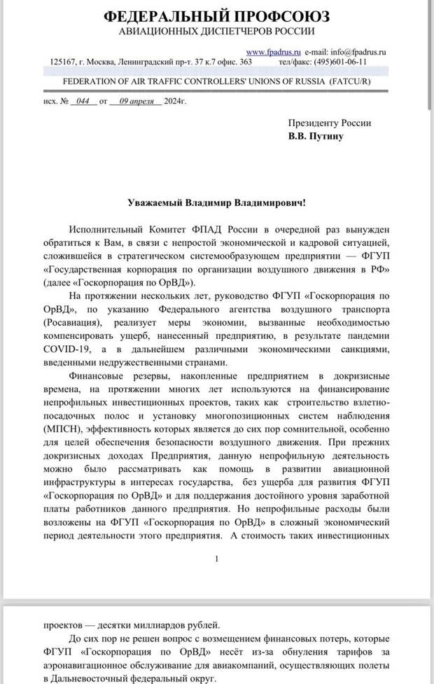 Федеральный профсоюз авиационных диспетчеров России обратился к президенту Владимиру Путину с просьбой принять срочные меры ради безопасности полетов.