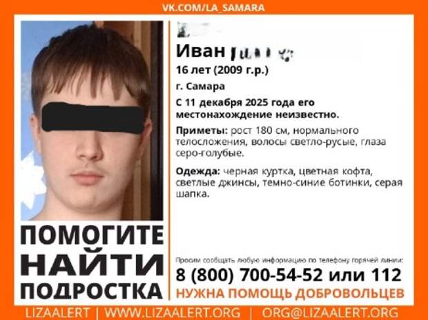 Добровольный поисковый отряд «Лиза Алерт» опубликовал ориентировку на поиски 16-летнего Ивана Н. из Самарской области