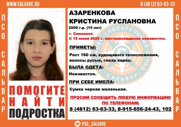 Любую информацию о школьнице можно сообщить по телефонам: инфорг поиска Ума (Анастасия) +7(915) 656-24-43, по общему номеру «Сальвар» 8 (4812) 63-63-33 или по 102.