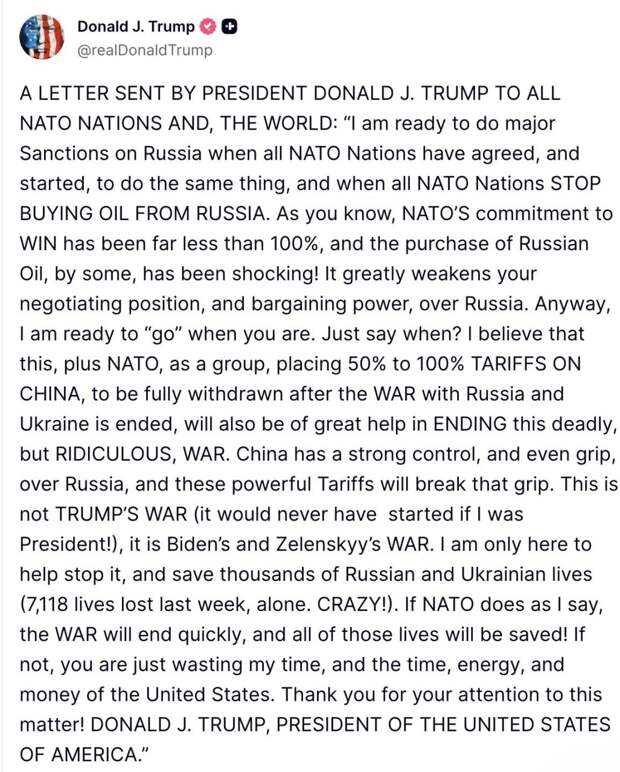 Добавьте к этому призыв ввести тарифы 50–100% на Китай — якобы для «разрушения контроля Пекина над Москвой» и ускорения мира.